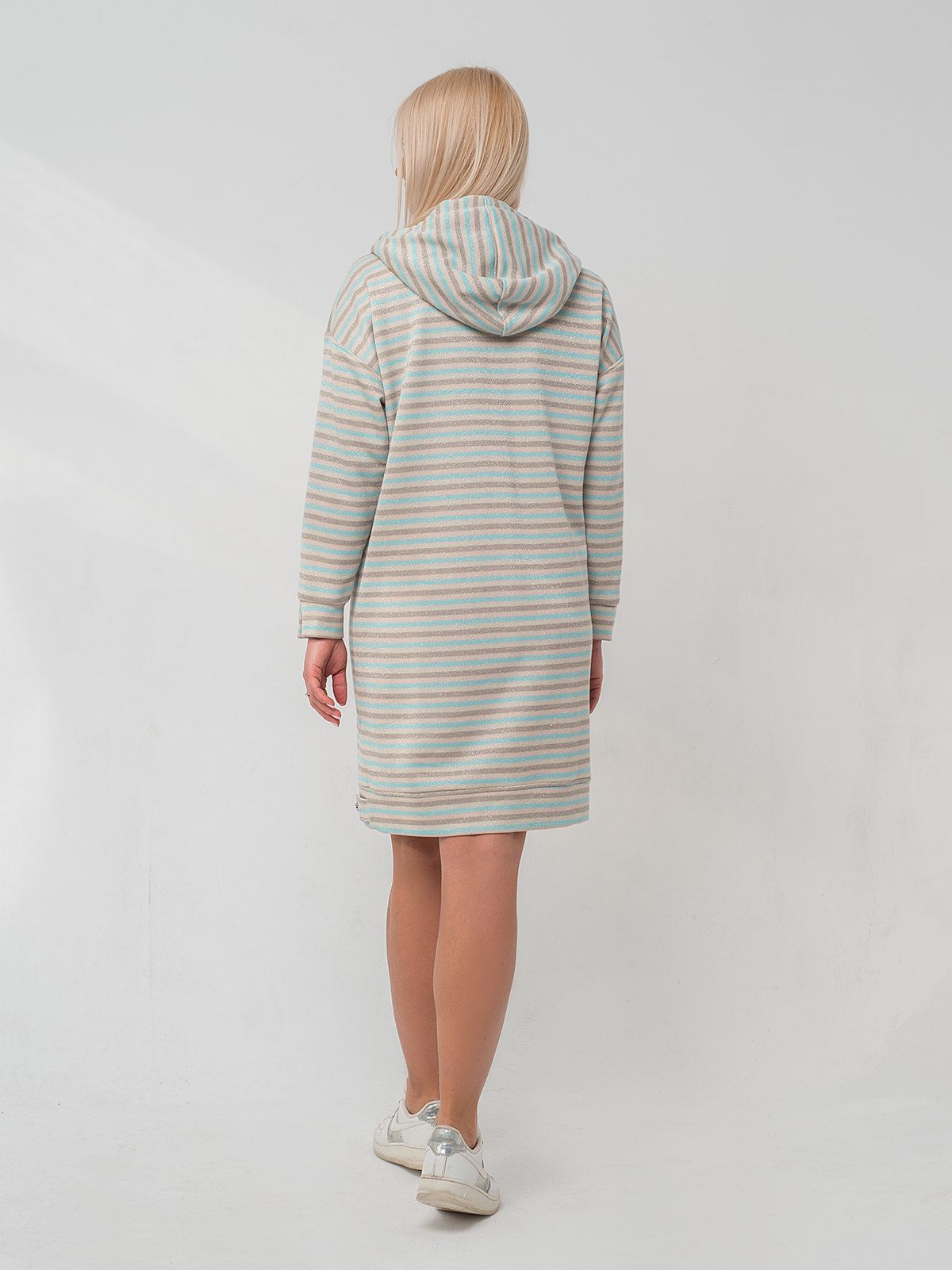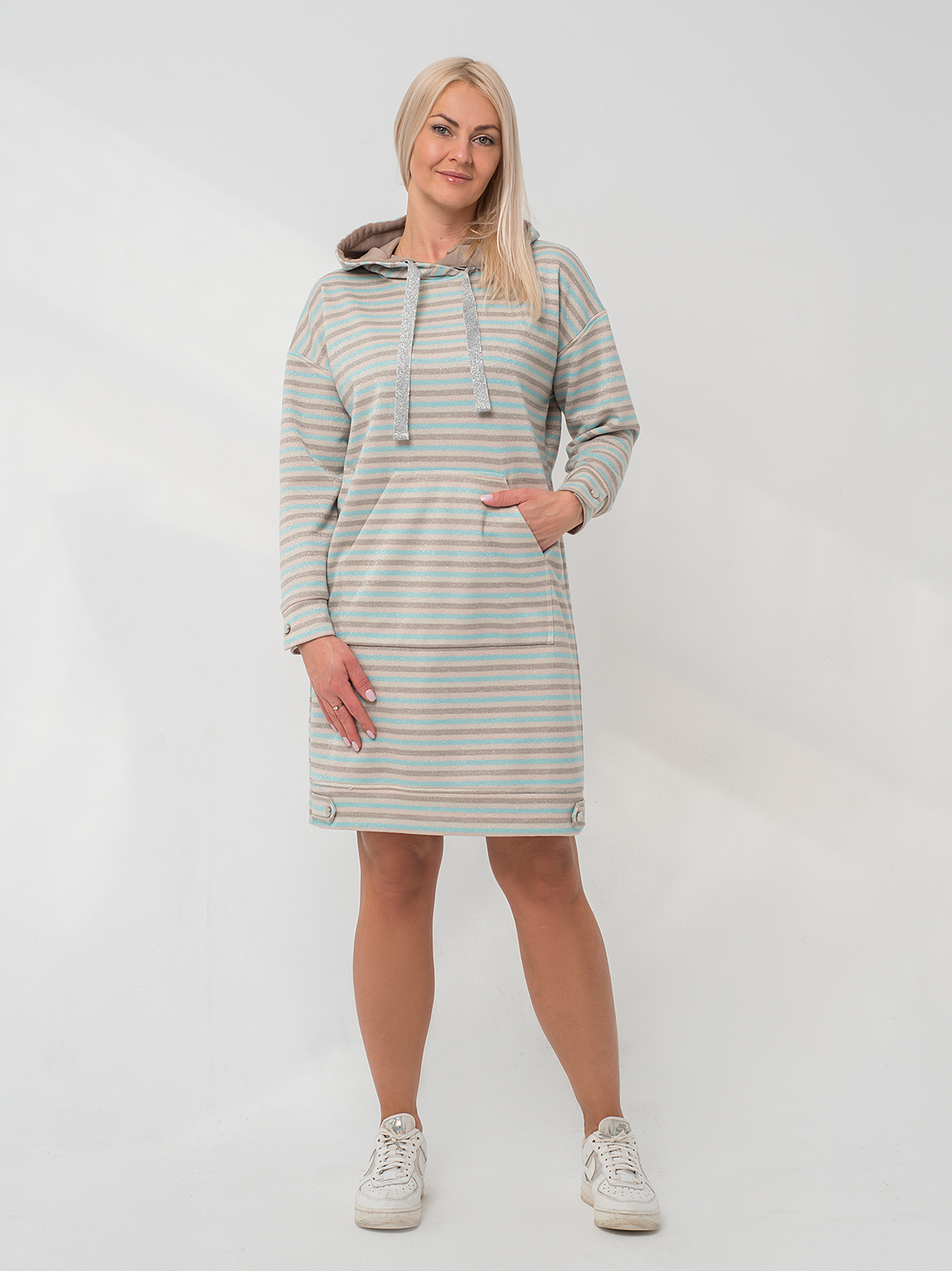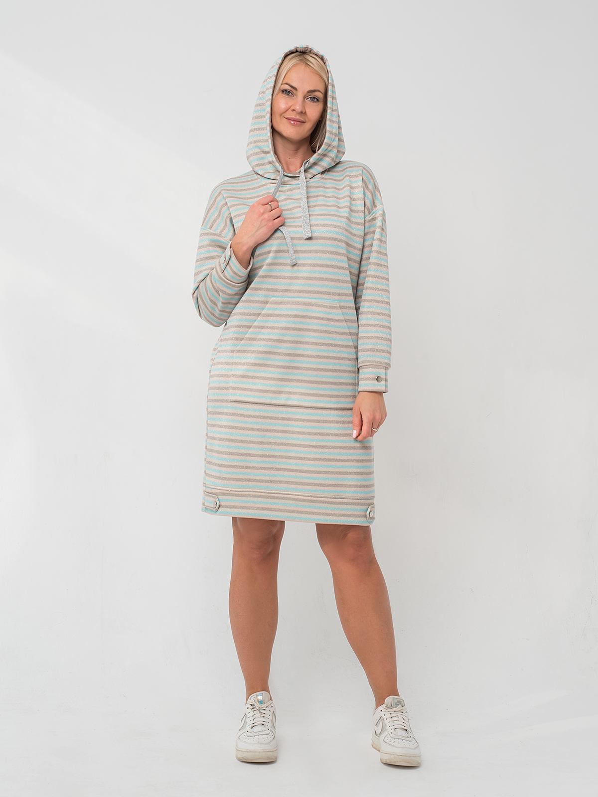 Платье-худи свободного силуэта с накладным карманом-кенгуру, с капюшоном и декоративным шнурком.
